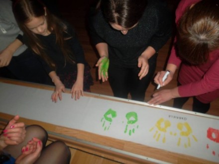 Svarbiausią šio susitikimo akimirką savo delnų atspaudais ant drobės geltonais, žaliais ir raudonais dažais buvo atspausta Lietuvos Respublikos vėliava.
