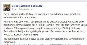 „Bet aš vistiek gerbiu Putiną. Jis nuostabus prezidentas, o ne pahalujus amerikasosas. Kad mums tokį…“ – savo paskyroje FB parašė V.Lekstutis, taip pat primindamas, kad „LDK Valstybės pavadinimas Lietuvos Didžioji Kunigaikštystė galutinai nusistovėjo apie XIII a. viduryje. Sostinė (bent jau nuo Gedimino laikų) – Vilnius. Pilnas pavadinimas pagal Lietuvos statutą – Didžioji Lietuvos, Žemaitijos ir Rusijos kunigaikštystė“.