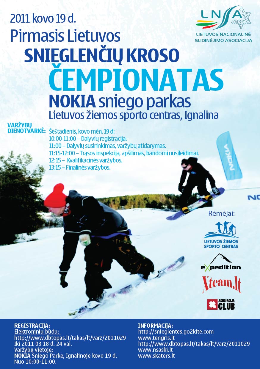 Atrodytų, sniegas jau gerokai aptirpęs, tačiau snieglentininkai ketina dar pasimėgauti jo likučiais. Šį šeštadienį, kovo 19 dieną, Ignalinoje, Lietuvos Žiemos Sporto Centre, NOKIA Sniego Parke įvyks „Lietuvos Snieglenčių Kroso Čempionatas“.