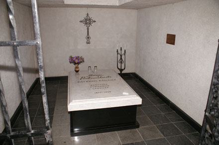 Kunigas Kazimieras Bukontas, su kuriuo rašytoją siejo ilgametė draugystė, ilsisi amžinojo poilsio vietoje priešais įėjimą į koplyčią.