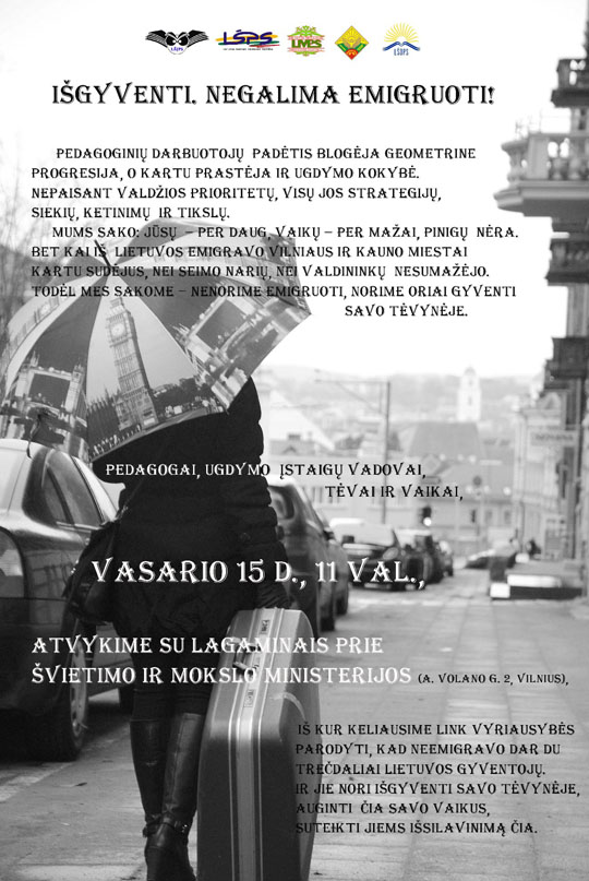 Vasario 15 d. šešios Lietuvos švietimo profesinės sąjungos kviečia švietimo bendruomenę į atvykti į Vilnių, kur rengiama protesto akcija „Išgyventi. Negalima emigruoti!“. Savaitę prieš neterminuotą streiką vyksiantis renginys – įspėjimas valdžiai dėl rimtų mokytojų ketinimų.