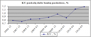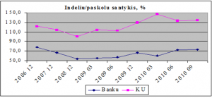 KU privalumas, tikriausiai, yra tai, kad jų skolinimo šaltinis – tai pajininkų indėliai-pajai, kurie suteiktų paskolų sumas viršija beveik net 1,5 karto. Kai jų ,,didieji“ broliai – bankai tokiu apsirūpinimu kredito ištekliais pasigirti negali: jų turimi indėliai tesudaro apie 70 % suteiktų paskolų sumų (grafikas Nr. 10). Kita bankų kredito išteklių dalis – motininių bankų pinigai. Tiesa, paskutiniais ketvirčiais šis rodiklis ,,gerinamas“, motininių bankų lėšoms sparčiai bėgant iš šalies ekonomikos.