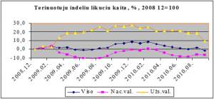Ir gerokai kuklesne palyginimų gama pranešta, kad per tris šių metų ketvirčius BVP sukurta 0,1 procento mažiau, nei per 2009 m. atitinkamą laikotarpį. Visiškai nutylint, kad, palyginus su gretimu, praėjusių, 2009 m. 9-nerių mėnesių, laikotarpiu, t. y. II-IV ketvirčių sukurto BVP, dabartinis 9 mėn. BVP net 2,7 % mažesnis! O tai reiškia, kad mūsų ekonomika šiandien vis dar krenta, palyginti su tuo, kokia ji buvo vakar (gretimais devyniais mėn.); ir krenta 27 kartus (2,7/0,1) greičiau, nei buvo užvakar (palyginus su ,,atitinkamu“ praėjusių metų laikotarpiu). O tai tikrai mažiau ,,džiugu“.