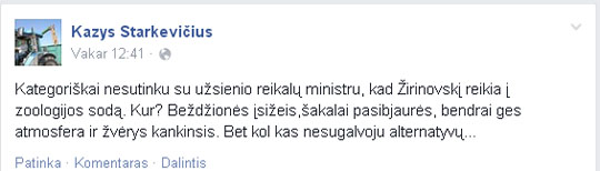 „Kategoriškai nesutinku su užsienio reikalų ministru, kad Žirinovskį reikia į zoologijos sodą. Kur? Beždžionės įsižeis, šakalai pasibjaurės, bendrai ges atmosfera ir žvėrys kankinsis“, – savo paskyroje socialiniame tinkle „Facebook“ paskelbė Seimo TS-LKD frakcijos narys.