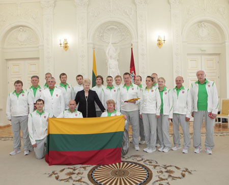 Lietuvos Respublikos Prezidentė Dalia Grybauskaitė į Londono Parolimpines žaidynes išvykstantiems Lietuvos sportininkams iškilmingai įteikė valstybės vėliavą.