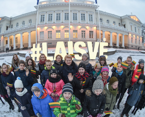 Lietuvos Respublikos Prezidentė Dalia Grybauskaitė drauge su 25 mokiniais iš Sausio 13-osios mokyklos įžiebė užrašą #Laisvė, simbolizuojantį prieš ketvirtį amžiaus apgintą Lietuvos nepriklausomybę.