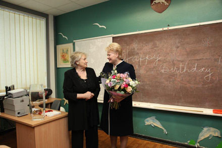 Lietuvos Respublikos Prezidentė Dalia Grybauskaitė apsilankė sostinės S. Nėries gimnazijoje, kurią yra baigusi, ir pasveikino savo anglų kalbos mokytoją Stefaniją Kasiulaitienę 70-ojo jubiliejaus proga.