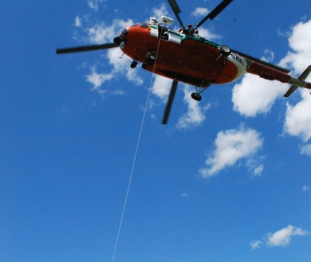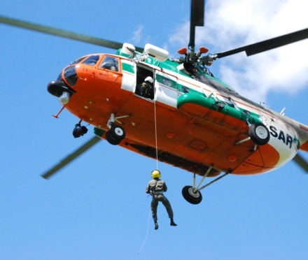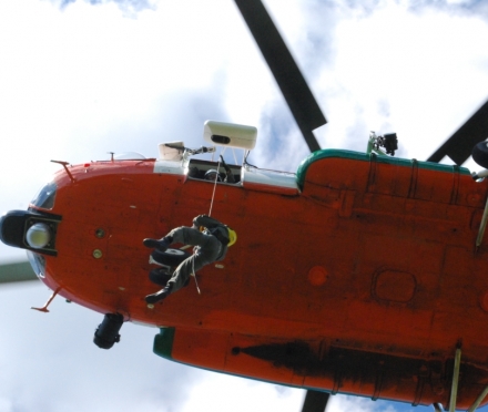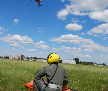 Gelbėti tariamo nukentėjusiojo (jo vaidmenį atliko manekenas) siunčiamas Karinių oro pajėgų paieškos ir gelbėjimo darbų sraigtasparnis Mi-8. Iš 22 metrų aukštyje pakibusio sraigtasparnio su specialia įranga nuleidžiamas gelbėtojas, nukentėjusysis saugiai įkeliamas į sraigtasparnį ir išskraidinamas. Gelbėjimo operacija atlikta puikiai, ji užtruko apie 15 min.