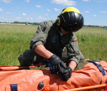 Vakar Karinių oro pajėgų Aviacijos bazės (Šiauliai) Sraigtasparnių eskadrilės planinių skrydžių metu buvo surengtos nukentėjusiojo gelbėjimo darbų pratybos.