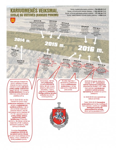 Pastarosiomis dienomis ne kartą viešai buvo teigiama, jog kariuomenės „auksinių šaukštų” pirkimo istorijoje prokurorai neatliko savo pareigų, neva netyrė, neva nesidomėjo ir tik po skandalo neva atnaujino… Tuose teiginiuose daug netiesos, bet ji noriai kartojama. Vakar taip pat buvo išplatintas vienas infografikas, kuriame aptikome labai daug, mūsų vertinimu, rimtų netikslumų. Tikime, kad jie atsirado ne iš piktos valios, bet nenorėdami, kad žmonės būtų klaidinami, pateikiame ir savo variantą ir dar kartą primename chronologinę įvykių seką.
