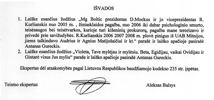 Skaitome vieną Violetos Gureckienės raštą: „2010 metų balandžio mėnesį (likus keliems mėnesiams iki A.Gureckio nusišovimo – KK) buvo pradėta domėtis mano dukra B.Rumšiene. Buvo išgriauta dalis tvoros, esančios Lapėse, Kauno r., per kurią buvo patekta į kiemą ir buvo skaičiuojamos namo plytos. Šį „patikrinimą“ atliko Vilius Paulauskas ir Stasys Čistovas“.