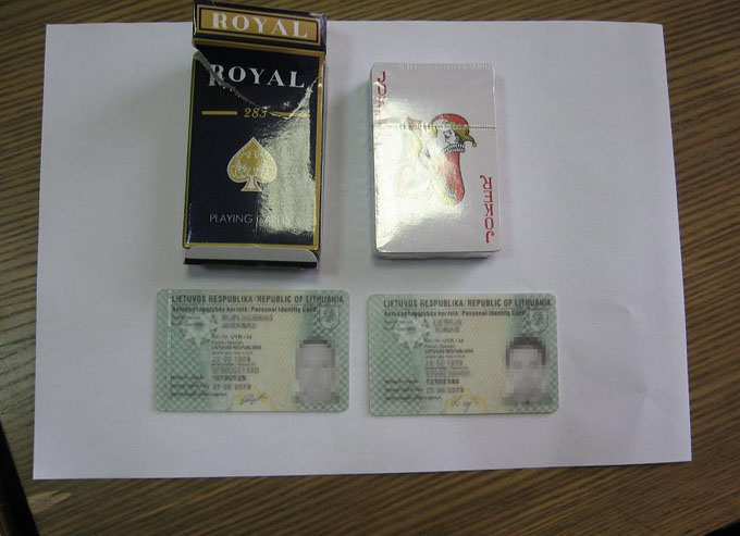 Automobilio daiktadėžėje VSAT pareigūnai aptiko kortų kaladę. Joje tarp kortų buvo paslėptos dvi, įtariama, suklastotos asmens tapatybės kortelės. Jos esą išduotos 31-erių ir 32-ejų Lietuvos piliečiams.
