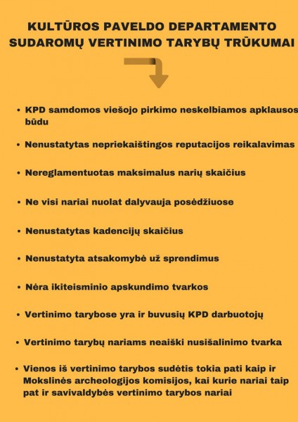 STT korupcijos prevencijos specialistai įvardijo galimus korupcijos rizikos veiksnius nekilnojamojo kultūros paveldo vertinimo tarybų sudarymo ir veiklos srityse. Pažymėta, kad nėra aiškios vertinimo tarybų sudarymo tvarkos, nėra nustatytų tarybų narių atrankos kriterijų ir jų kadencijų skaičiaus. Tarybų nariams nėra įtvirtinto nepriekaištingos reputacijos reikalavimo, viešųjų ir privačių interesų deklaracijos pildymo prievolės. Nustatyta atvejų, kai vertinimo tarybų nariai, būdami ir Mokslinės archeologijos komisijos nariais, vertina savo pačių, pavaldinių ar konkurentų darbus, kartu sprendžia ir dėl objektų vertingųjų savybių.