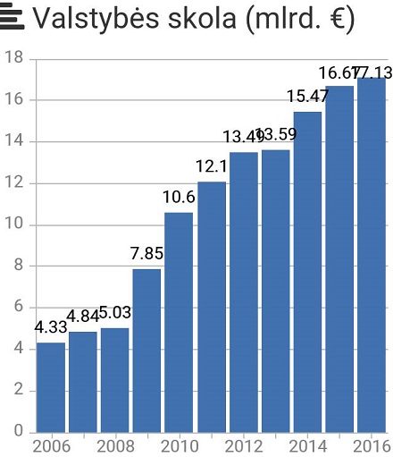 Pateiktame grafike matome, kaip per paskutinius 10 metų išaugo Lietuvos skola. Lietuvos skola per vieną ekonominį nuosmukį 2008 -2012m. išaugo daugiau nei tris kartus.
