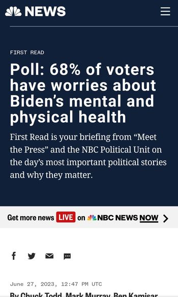 Šiais metais birželį „Washington Post-ABC News“ atlikta apklausa parodė, kad tik 32% respondentų mano, kad Bidenui pakanka „proto aštrumo“, kad galėtų būti veiksmingas Baltuosiuose rūmuose. 68% visų rinkėjų teigė nerimaujantys dėl to, ar Bidenas turi reikiamą psichinę ir fizinę sveikatą, kad galėtų būti prezidentu. O 55% net teigė, kad jiems dėl to kyla „didelių“ rūpesčių.
