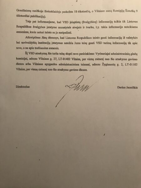 LR VSD vadovas Darius Jauniškis 2017-09-29 raštu Nr.18-7958 taip pat patvirtino, kad Zigmas Vaišvila nėra grėsmė Lietuvos nacionaliniam saugumui: „Informuojame, kad „VSD ir AOTD 2015 metų grėsmių nacionaliniam saugumui vertinime… nei signatarai Zigmas Vaišvila ir Rolandas Paulauskas, nei buvęs Seimo narys Audrius Nakas nėra įvardinti kaip grėsmė nacionaliniam saugumui.“(priedas).“