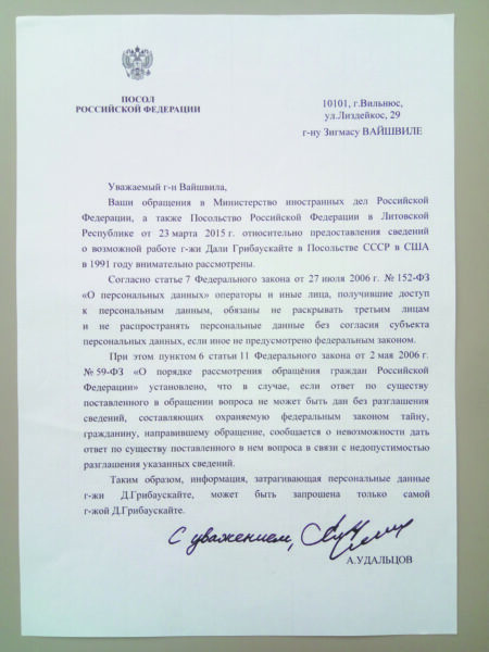 1991 m. Vašingtone D. Grybauskaitė pasisiūlė įdarbinama Lietuvos ambasadoje JAV. Ilgametis Lietuvos ambasadorius Stasys Lozoraitis atsisakė jos paslaugų, nes JAV Valstybės departamente sužinojo, kad ji dirba TSRS ambasadoje JAV. 2015 m. signataras Zigmas Vaišvila Rusijos URM raštu paklausė, kokiose pareigose ir nuo kada iki kada 1991 m. Dalia Grybauskaitė dirbo TSRS ambasadoje JAV? Atsakymas nenustebino – ši informacija Z. Vaišvilai gali būti atskleista, tik D. Grybauskaitei sutikus, o be to, tai yra Rusijos Federacijos valstybės paslaptis.