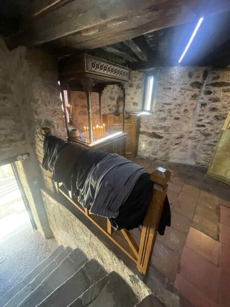 Tada dar statesnis kopimas į patį vienuolyną palei jo sieną – žemyn geriau nežiūrėti… Nieko, užbėgau. Žiūriu – kažkokių drabužių pridėta celėje, lyg kelnių. Pasirodo prižiūrėtojas, vyras, sako: „Jei nori į patį viršų, į koplyčią, užsidėk sijoną.“ Aaa, tai sijonai, o ne kelnės! Užsidedu, užkylu į vienuolyno koplyčią, suvenyrų parduotuvę, nusiperku bilietą – berods, 5 eurai.