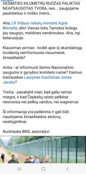 Atsakymas – konservatoriams tiesiant valstybės sienos apsaugos barjerą, apie DEŠIMTIES KILOMETRŲ RUOŽAS PALIKTAS NEAPSAUGOTAS TVORA, nes… saugojame paukštelius ir miško žvėris…