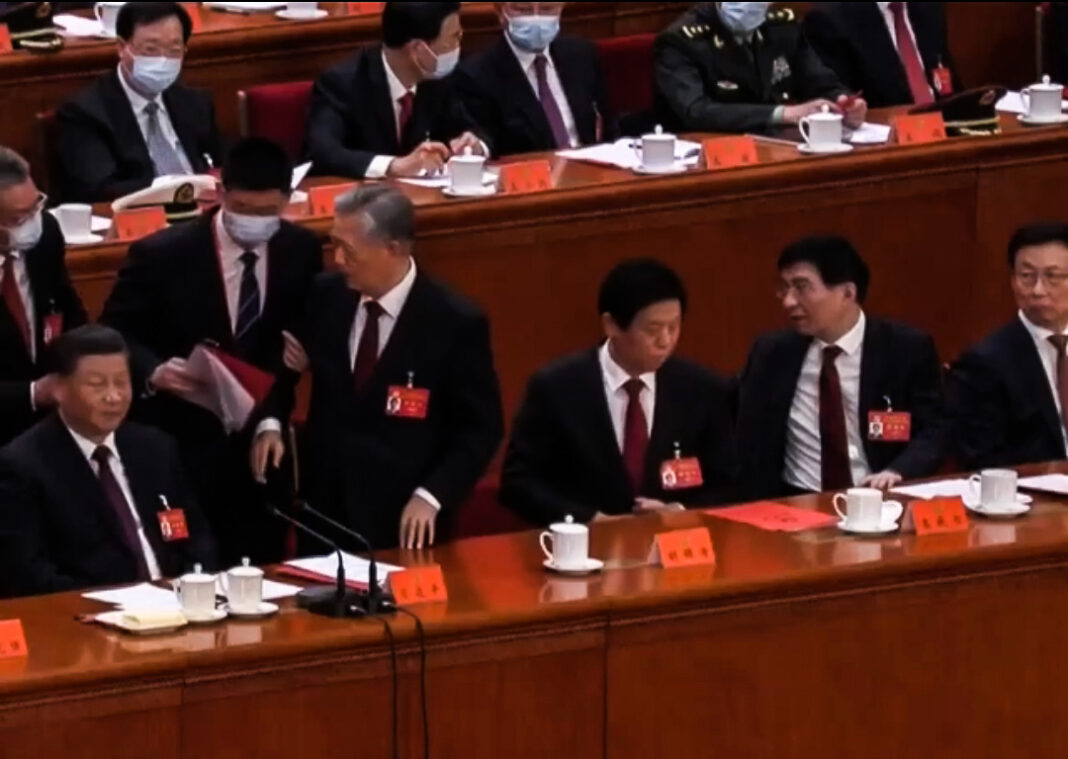 Buvęs Kinijos lyderis Hu Jintao, sėdėjęs Kinijos komunistų partijos kongreso prezidiume, buvo išvestas iš salės už parankės.