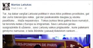 „Tai, ką dabar, vargšai Lietuviai politikai ir visos kitos politinės prostitutės, gal dar Jums tolerancijos reikia, gal dar pasikvieskite daugiau jų visokių paukštukų … Maža nepasirodys. Tokius įvykius tikrai galima buvo numatyti, tai teroristų kelias į Europą su imigrantais. Savo Lietuvius geriau susigrąžinkite iš užsienio, savo Lietuvių vaikus priglauskite, kurie paliekami gimdymo namuose, o tada žiūrėkite į pasaulį išskėstom rankom“, – socialiniame tinkle „Facebook“ parašė Panevėžio savivaldybės tarybos narys Mantas Leliukas.